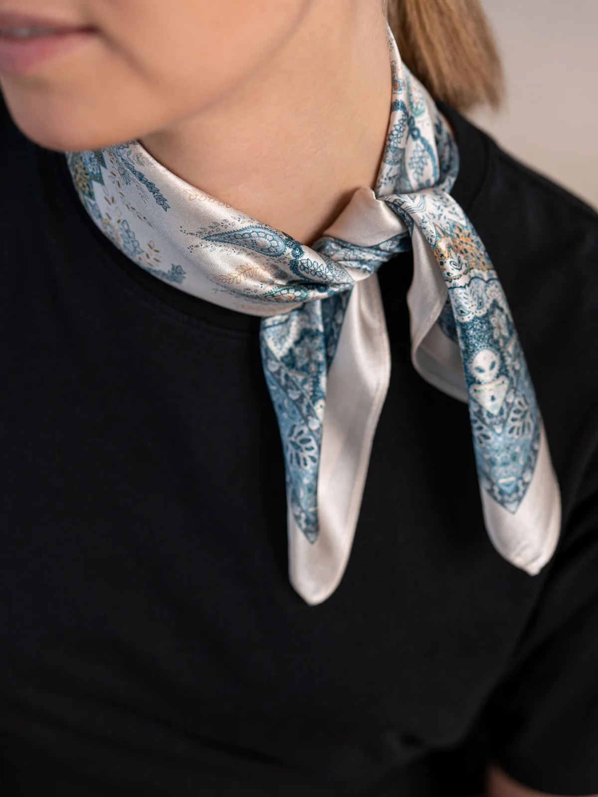Šilkinė skarelė – ryškus šio sezono mados akcentas, suteikiantis įvaizdžiui charakterio ir savitumo.